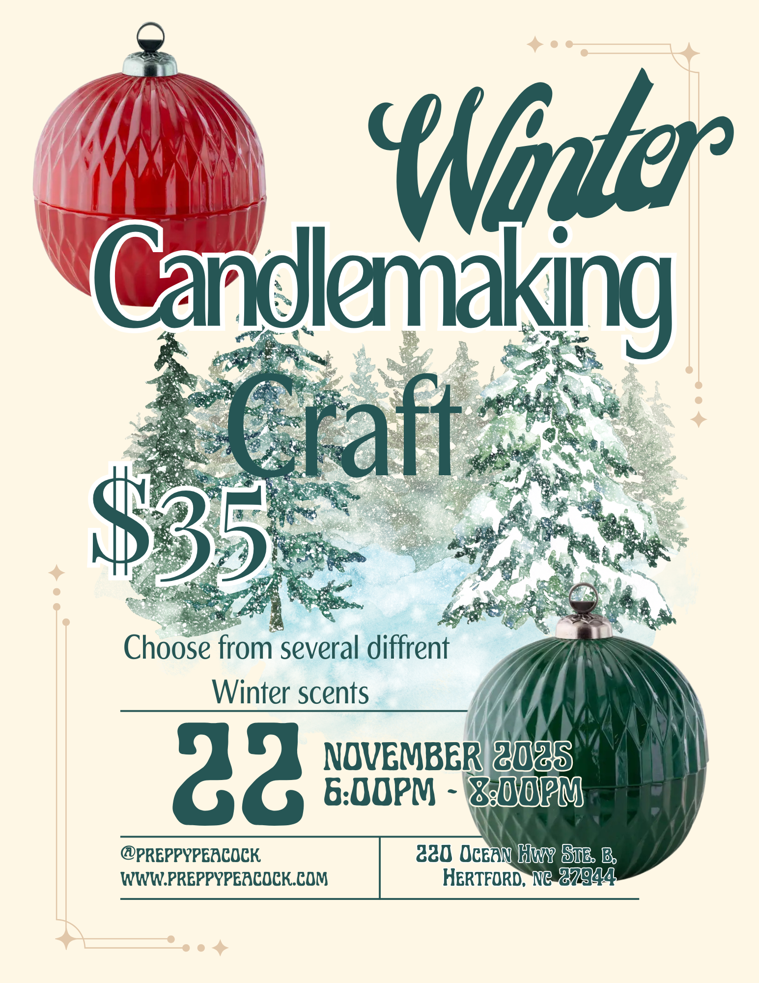 Warm up your winter at The Preppy Peacock Bookish Boutique with a cozy candle making workshop! You’ll hand-pour your very own candle into a chic seasonal jar, choosing from dreamy winter fragrances like sugar cookie, frosted pine, and cashmere vanilla. Perfect for brightening chilly nights or gifting with love, this class is all about sparkle, scent, and seasonal charm.
